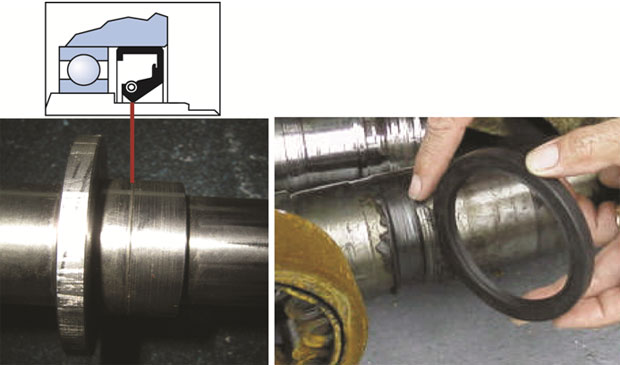 歷史上,保護(hù)軸承最常用的方法是使用唇形密封,這種密封件成本低廉,效果良好,因此被廣泛應(yīng)用,然而,在大量實(shí)踐中表明,唇形密封件有局限性,其依靠密封唇和軸之間的表面接觸來(lái)形成密封,這種表面接觸通常會(huì)對(duì)軸本身造成昂貴的損壞,如下圖所示。