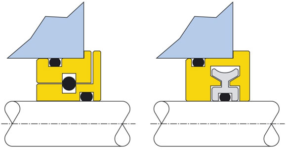 唇式密封的另一種選擇是軸承保護(hù)密封,軸承保護(hù)器的設(shè)計(jì)差異很大,其中一些通過(guò)O形環(huán)或楔形環(huán)橋接旋轉(zhuǎn)和固定部件之間的間隙,如上圖所示為軸承箱密封的兩種不同版本,由于某些類型的旋轉(zhuǎn)部件和固定部件之間的阻力較大,O形環(huán)和銳邊槽之間接觸的類型很容易受到損壞,尤其是在轉(zhuǎn)子結(jié)合低夾緊力的情況下,因此,這種設(shè)計(jì)現(xiàn)在被視為過(guò)時(shí)和無(wú)效的。