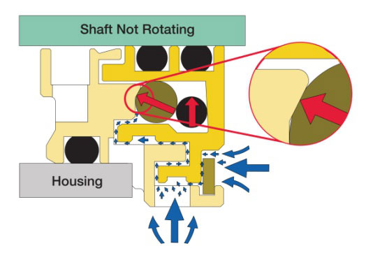 當(dāng)設(shè)備停止旋轉(zhuǎn)時(shí),微小間隙立即閉合,形成完美的密封,如下圖所示,這可防止灰塵和濕氣被吸入軸承殼,并消除軸承油污染。
