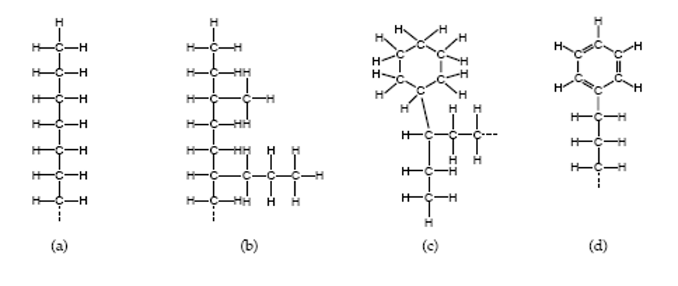 有兩種石油常用作潤滑劑的原料,即石蠟油和環(huán)烷油,其基本化學(xué)結(jié)構(gòu)如下圖所示,a和b為石蠟,c為萘,d為芳烴。石蠟是一種極好的潤滑劑,它很滑,在高溫下也很穩(wěn)定,但石蠟在低溫下會變成固體,此外,石蠟在氧化時會產(chǎn)生少量的殘留物,這些殘留物即堅硬且粘稠,從而失去潤滑效果,出于這個原因,大多數(shù)工業(yè)和運輸潤滑劑使用鏈烷烴油。