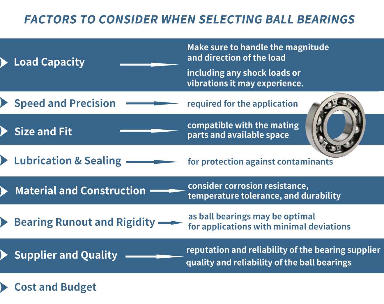 在選擇滾珠軸承時(shí),必須考慮負(fù)載能力、速度和精度要求、尺寸和配合兼容性、潤(rùn)滑和密封需求、跳動(dòng)和剛度公差、材料和結(jié)構(gòu)對(duì)環(huán)境的適用性等因素(見(jiàn)下圖)。有關(guān)更多詳細(xì)信息,請(qǐng)參閱下圖。