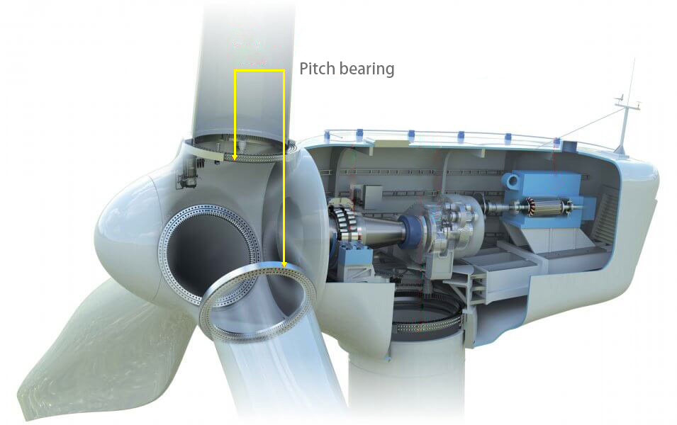 根據(jù)客戶的工作條件,沃恩的工程師使用了型號為16284001的雙列四點接觸球回轉(zhuǎn)軸承,方案將這些回轉(zhuǎn)軸承安裝在每個葉片的根部和輪轂的連接部分,目的是調(diào)整渦輪機(jī)的方向和葉片槳距角的大小,從而確保渦輪機(jī)能夠?qū)崿F(xiàn)垂直向風(fēng),并將輸出功率保持在安全范圍內(nèi)。
