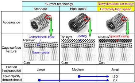 在軸承保持架上涂上特殊涂層可以減少保持架和小齒輪滑動區(qū)域之間摩擦產(chǎn)生的熱量,還可以提高保持架的耐磨性。因此,新開發(fā)的產(chǎn)品可以處理大約是標(biāo)準(zhǔn)保持架設(shè)計兩倍的小齒輪速度,大約是當(dāng)前高速保持架設(shè)計的1.5倍。